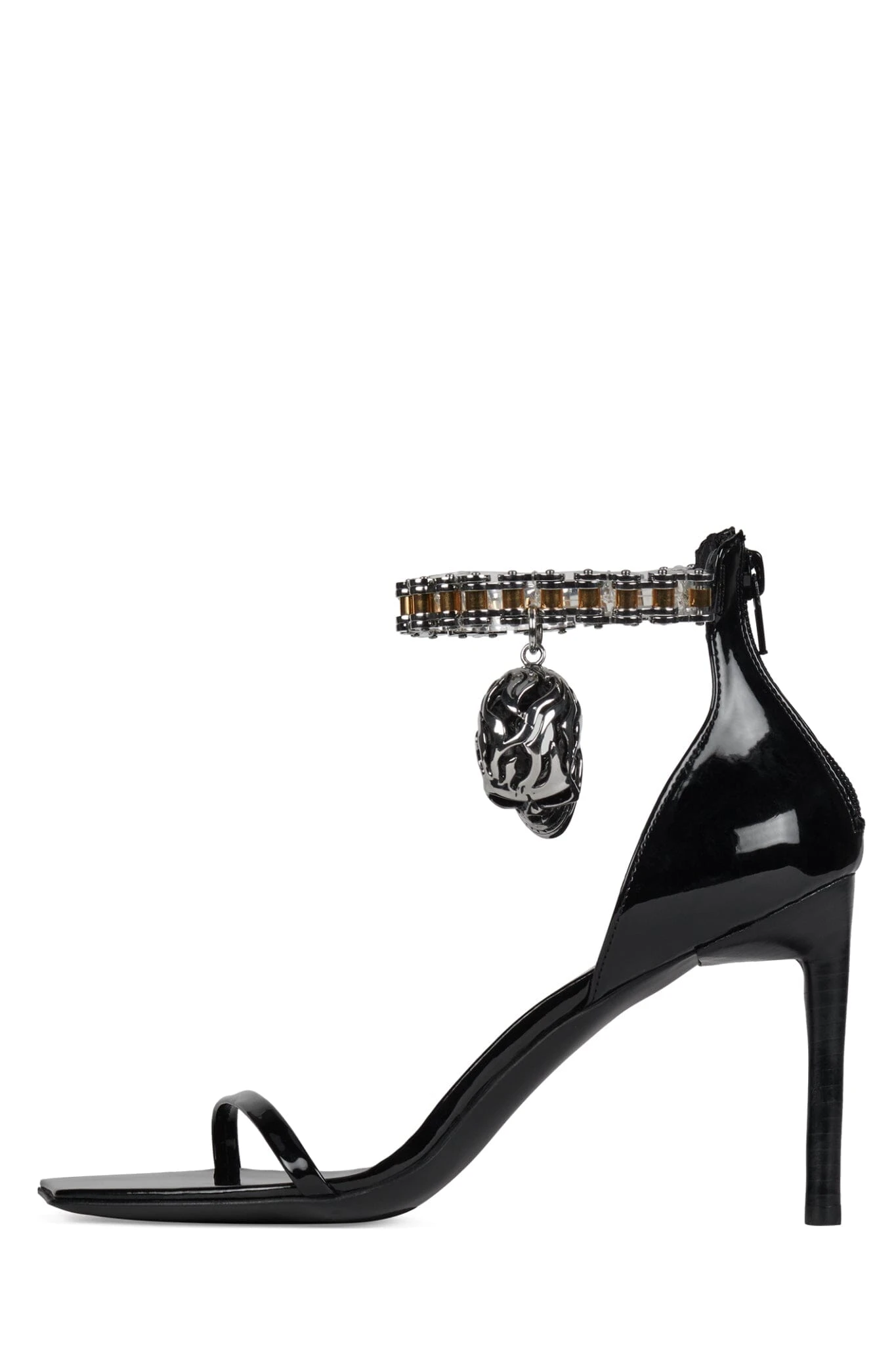 Minimalist square-toe heeled sandal with chain ankle strap and skull ornament