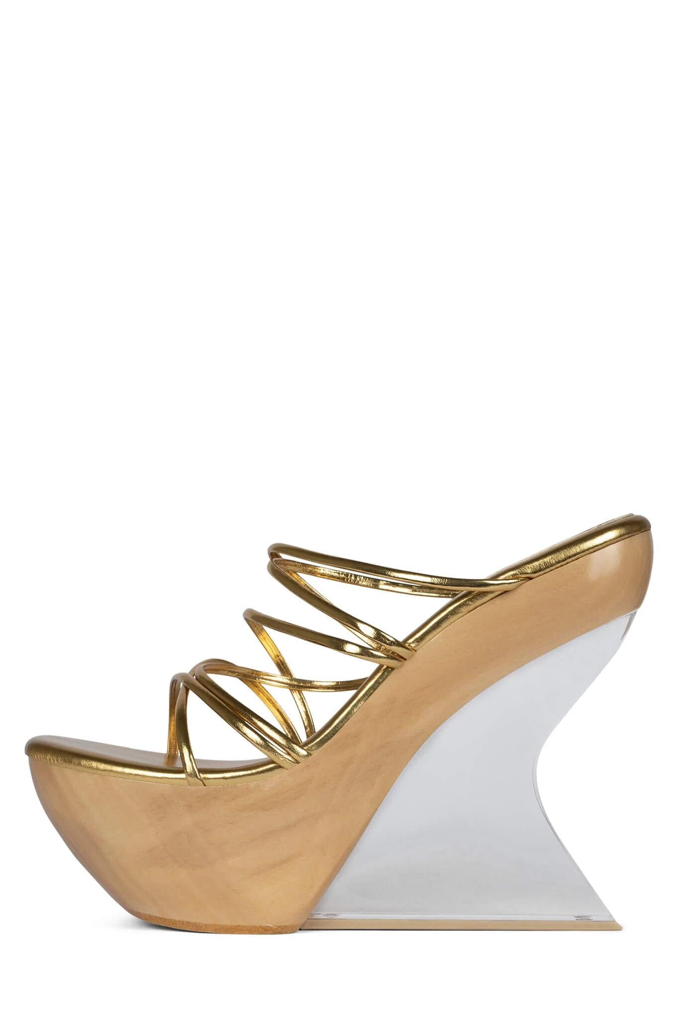 Strappy platform wooden sandal with lucite wedge