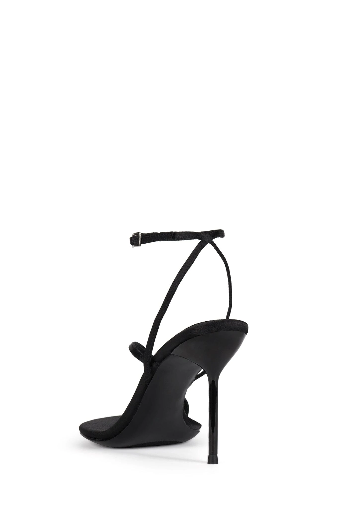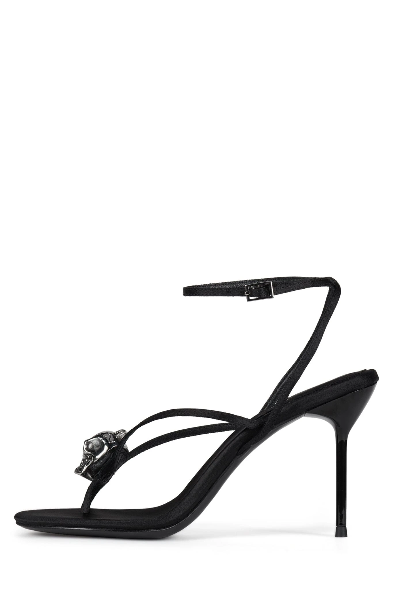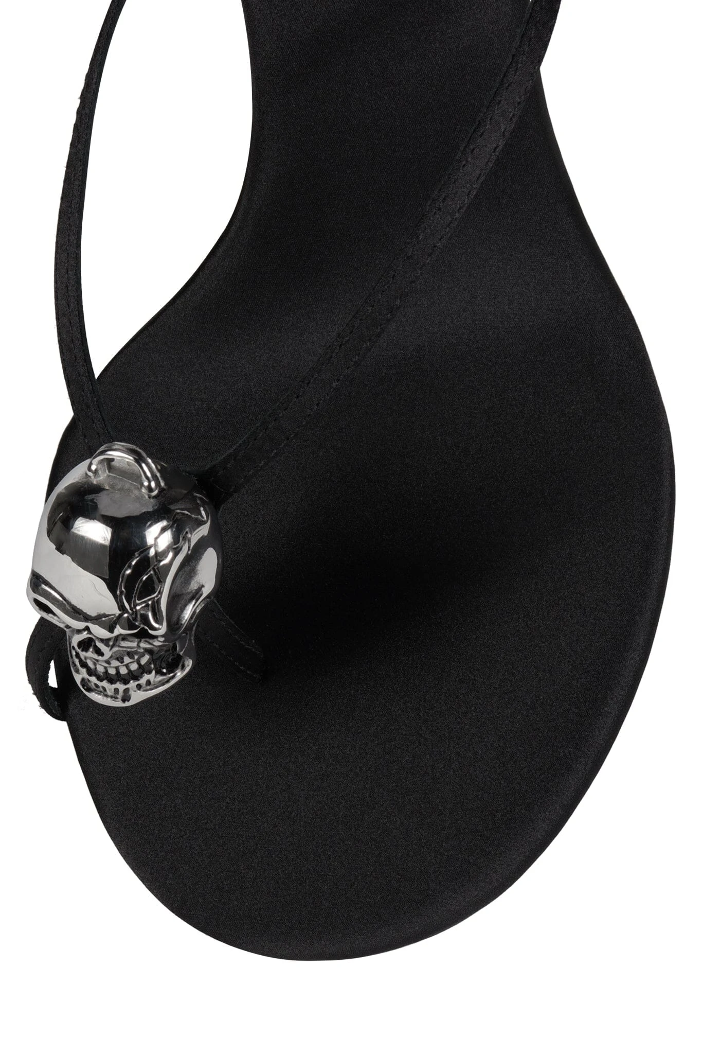Ankle-wrap heeled thong sandal with toe-ring and skull ornament
