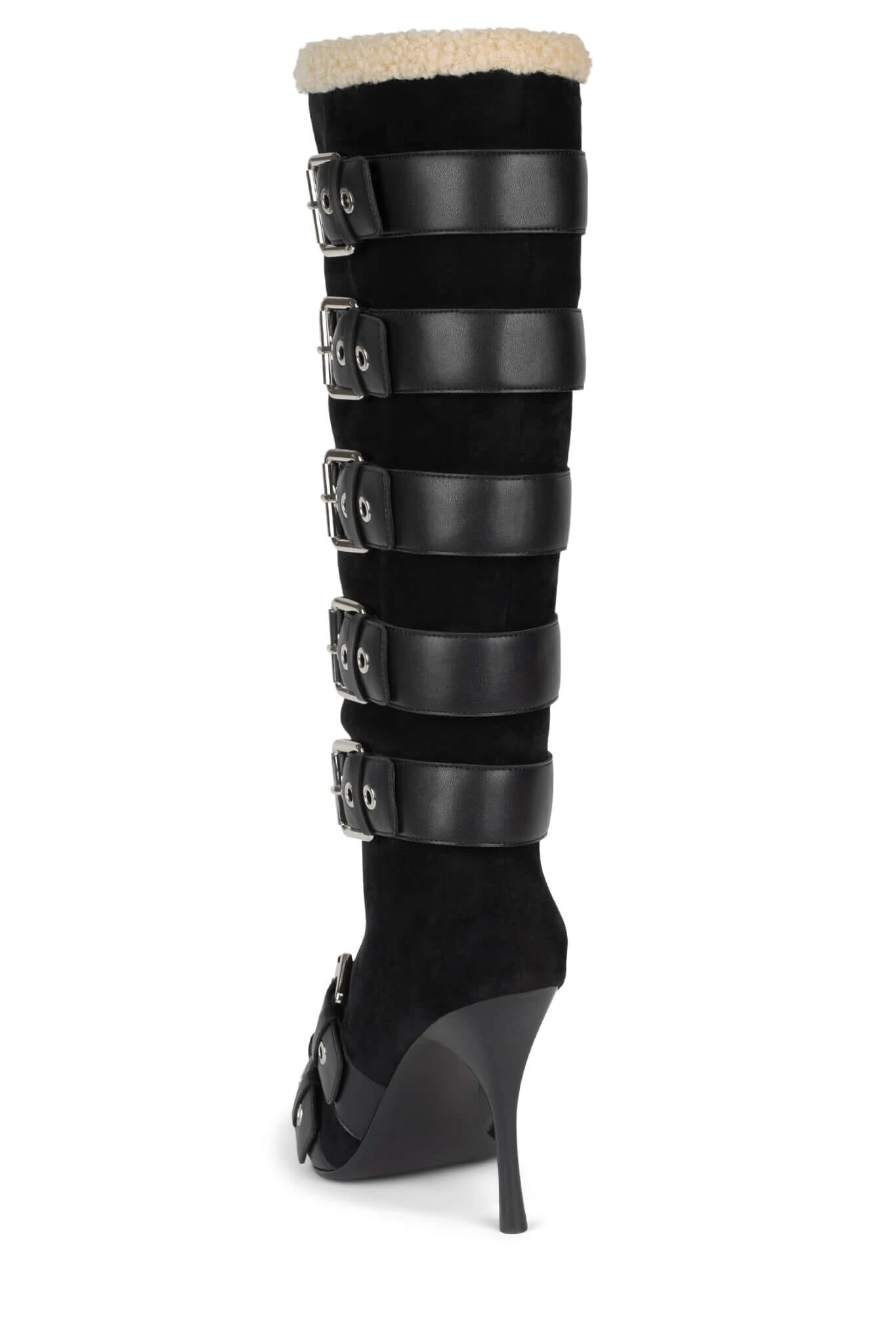 Pointed-toe stiletto boot with buckle detail and exposed faux-shearling liningÂ