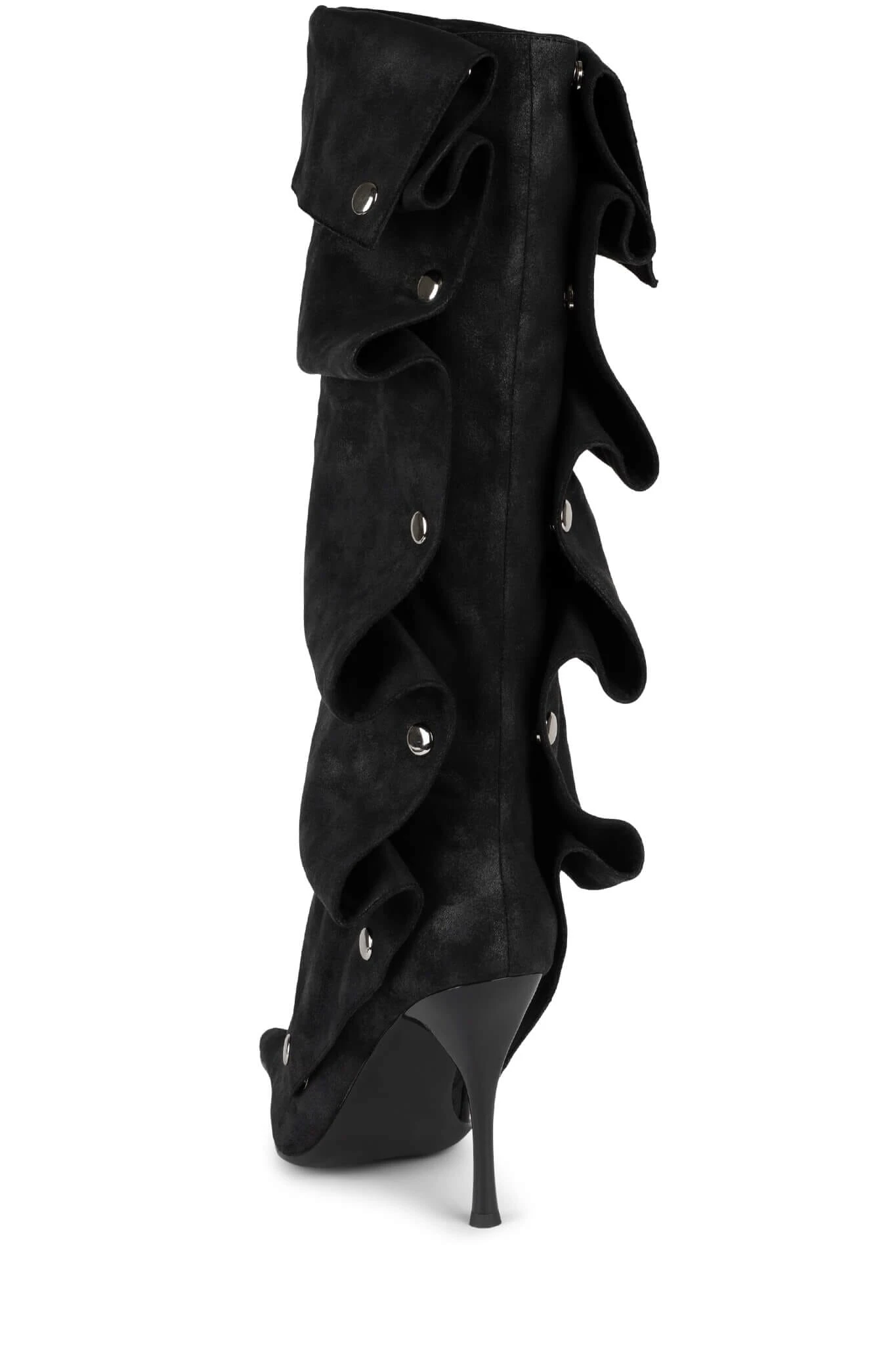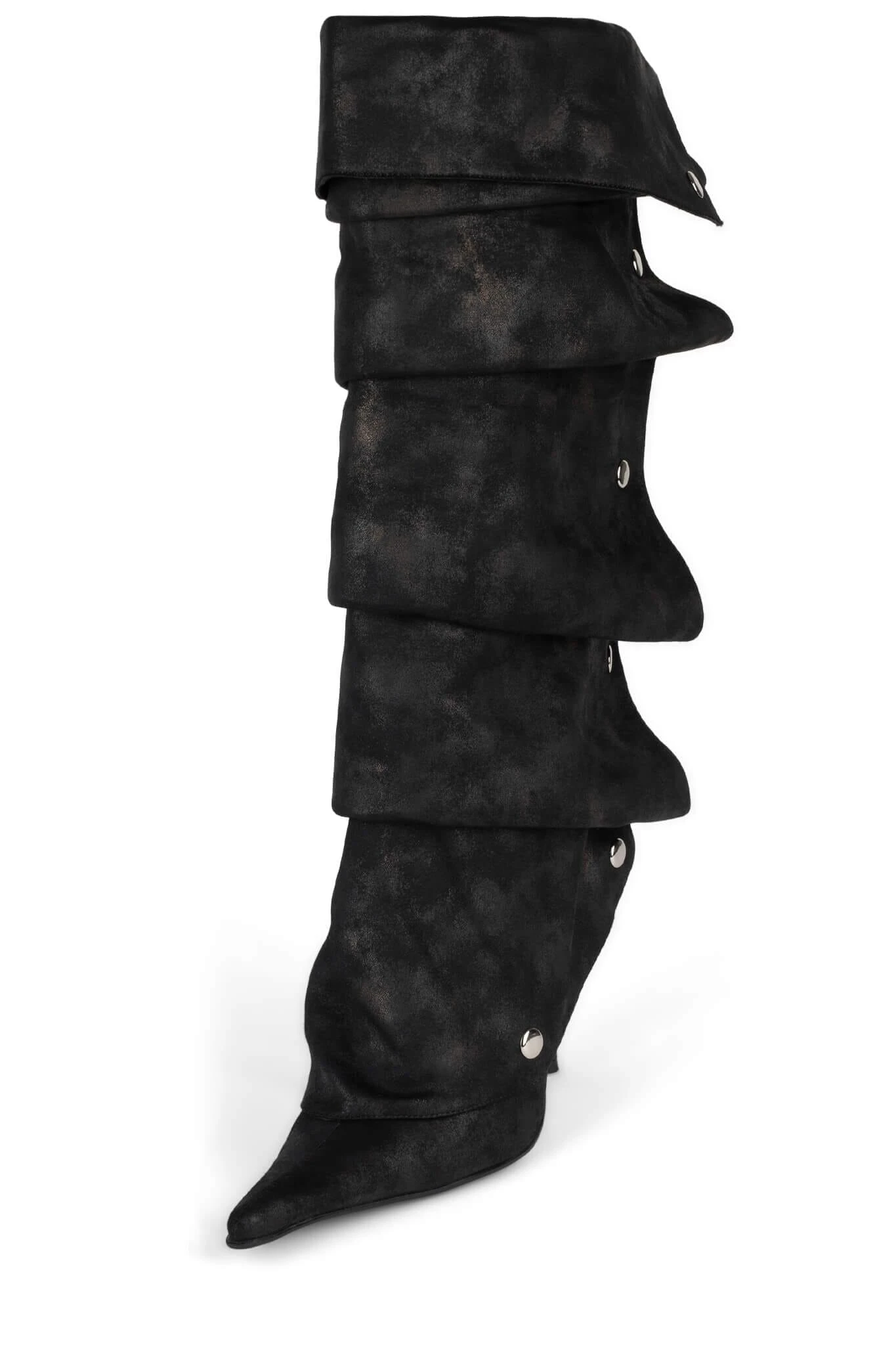 Pointed-toe stiletto knee-high boot with snap-off fold-over panel