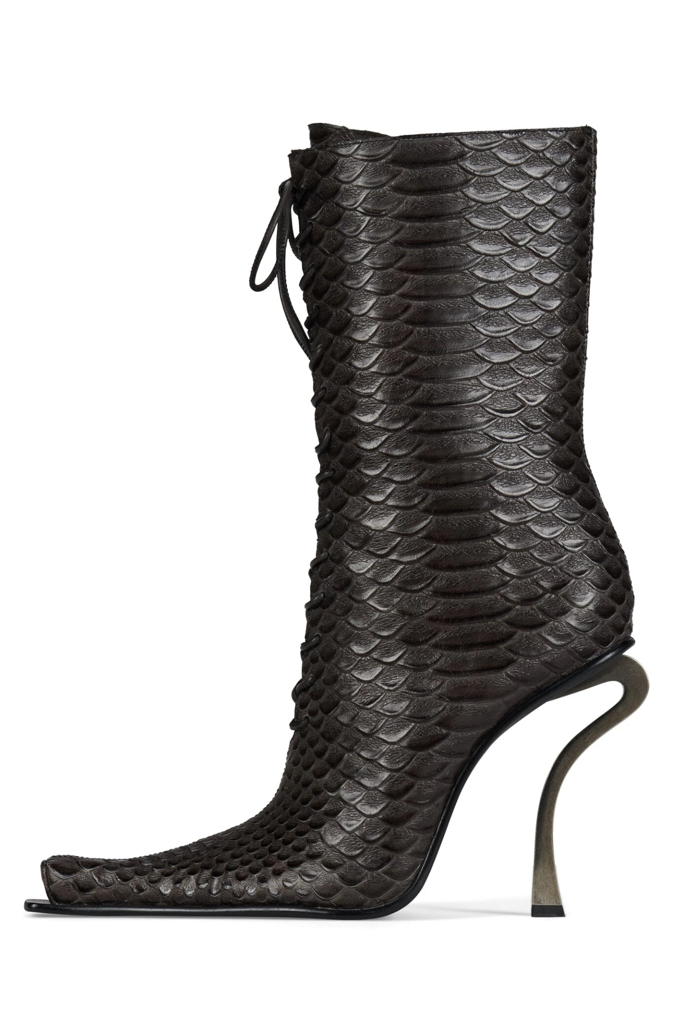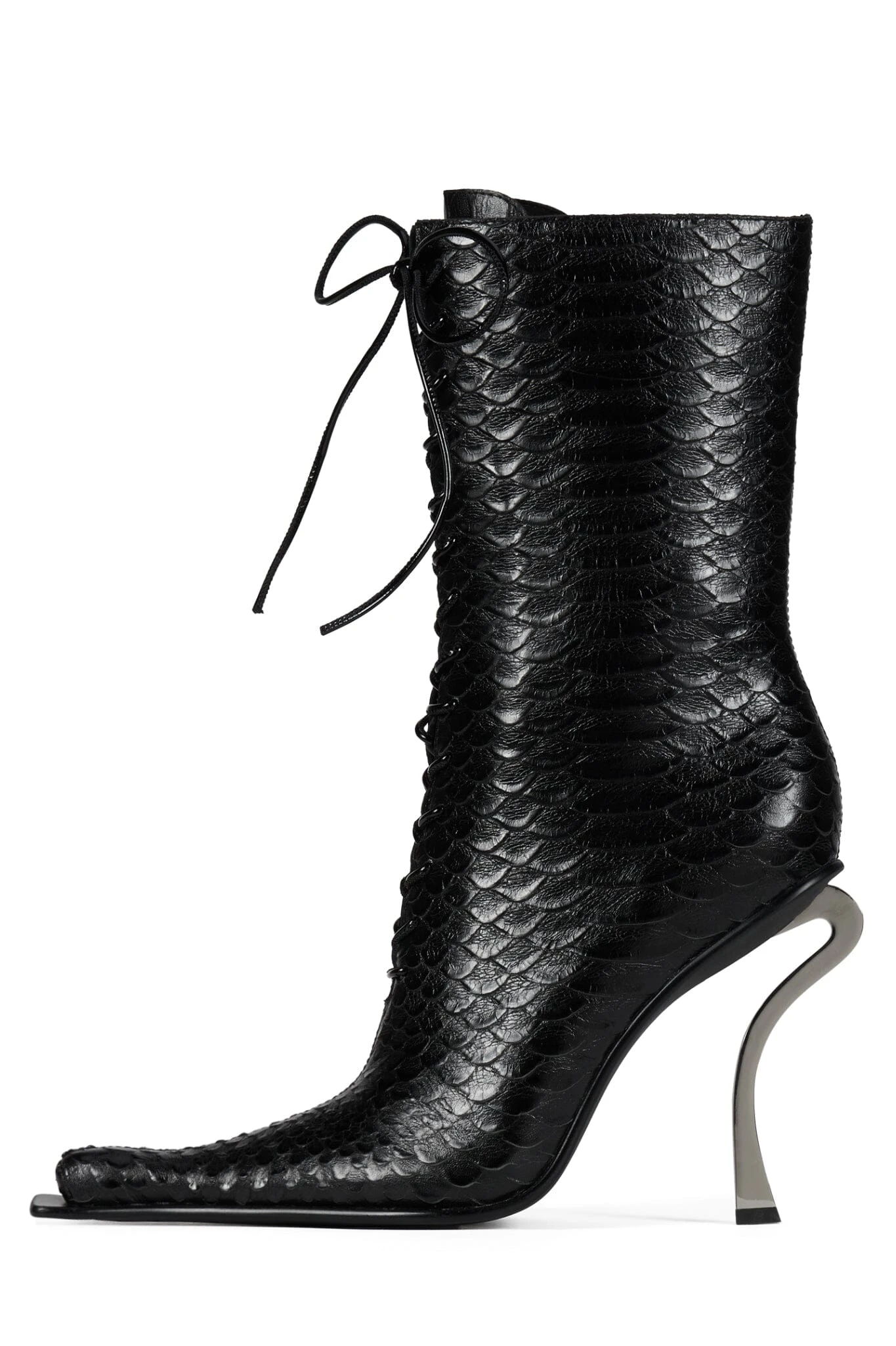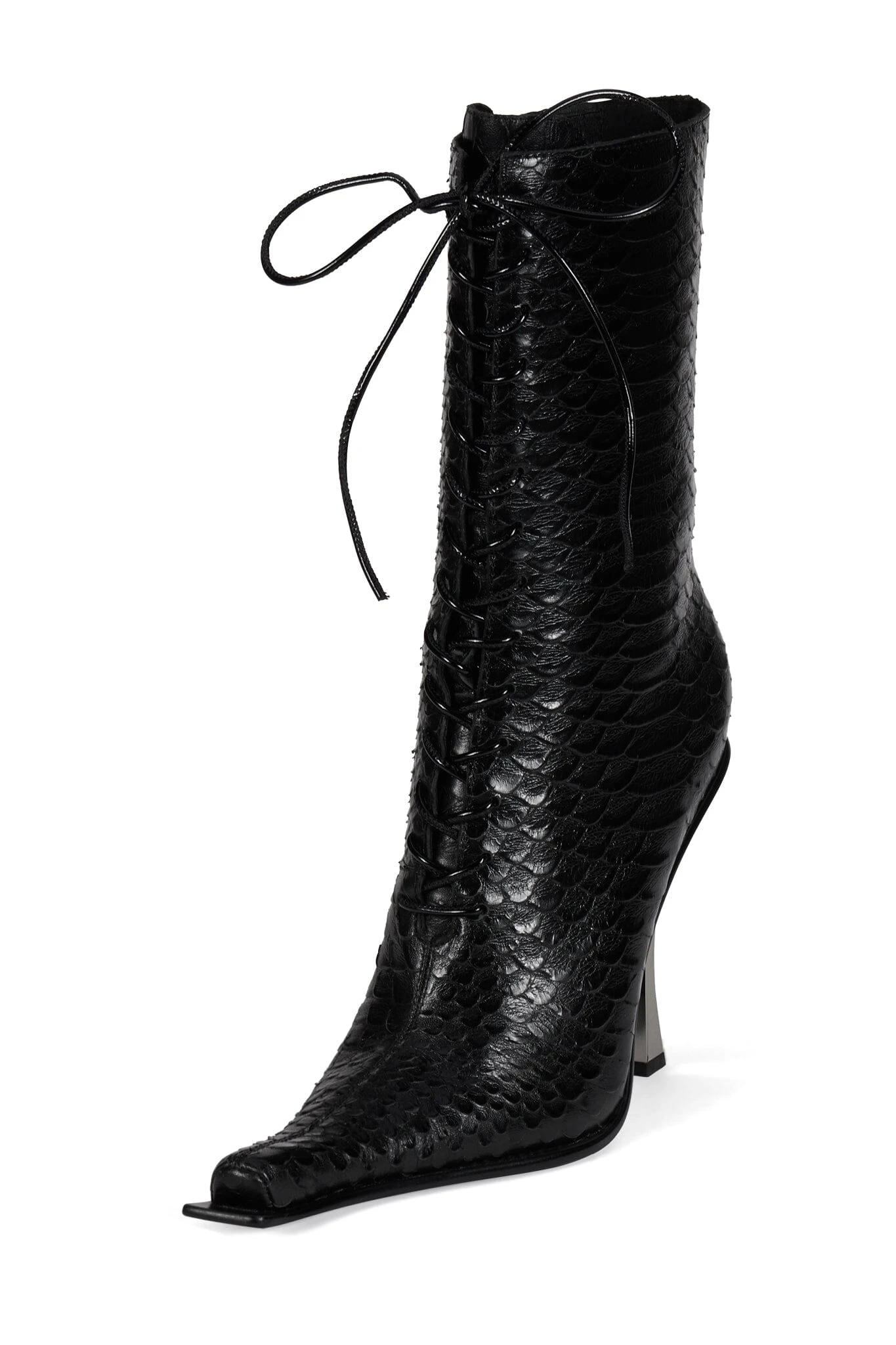 Exaggerated pointed toe lace-up boot with sculpted metal heelÂ